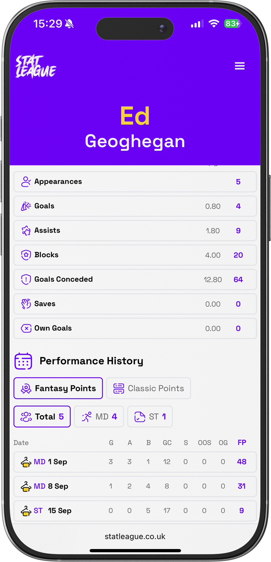 Player performances, detailed. View match-by-match records of timestamped goals, assists, and own goals, as well as additional recorded stats; saves, bonus points, fantasy points and more!